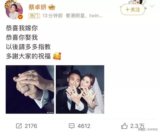蔡卓妍的官宣文案简单却充满甜蜜:“恭喜我嫁给人,恭喜你娶我,以后请多多指教,多谢大家的祝福。”言语之间,满是笃定与幸福。