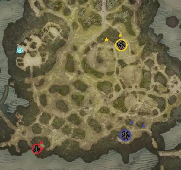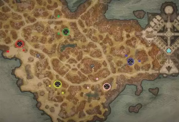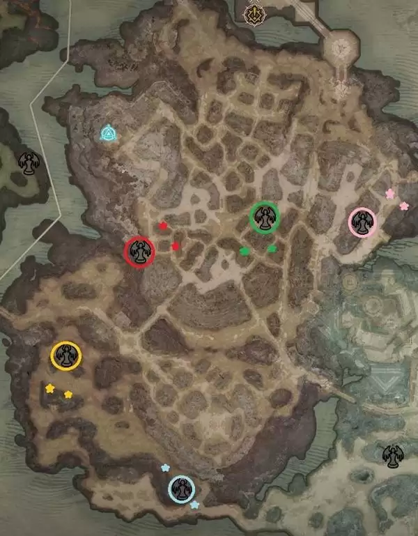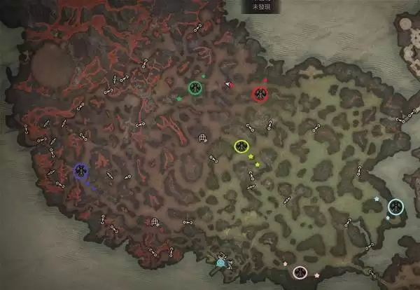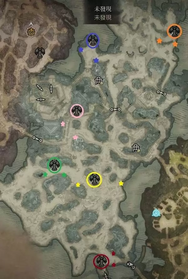 需要说明的是,以下列出的创世编年史位置是固定的,但伊纳瑞斯和莉莉丝雕像的具体位置可能存在些许差异。地图中用同色圆圈标出了编年史的位置,而两颗星星则代表了雕像可能出现的区域。