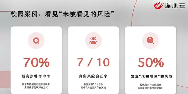 教育案例:我们为多所学校提供了心理健康异常风险预警模型。学校将模型接入安防系统,通过走廊、食堂等场所的监控摄像头采集学生的日常情绪与行为数据。经过一段时间的监测,模型能够识别每个孩子情绪的异常波动、攻击性倾向、压力过载等情况,并在出现异常时向老师预警。其中一所深度合作的学校反馈,模型预警的10名学生中,有6人确实存在明显的心理困扰。有一名学生曾因心理问题休学,复学后适应不良,本人并未向老师求助,但被模型精准捕捉。此外,超过一半学生的心理危机(如遭受霸凌、被孤立、与朋友发生严重冲突等)甚至是老师此前未曾留意到的。关键在于,我们预警的并非“孩子马上要跳楼”这类极端信号,而是那些真正可能导致危险事件发生的“前置信号”,从而将风险防范于未然。