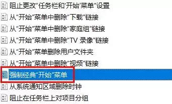 第四步,这时右侧会显示一长列具体的设置项。需要向下滚动,找到名为 “强制经典开始菜单” 的策略,然后双击它打开。