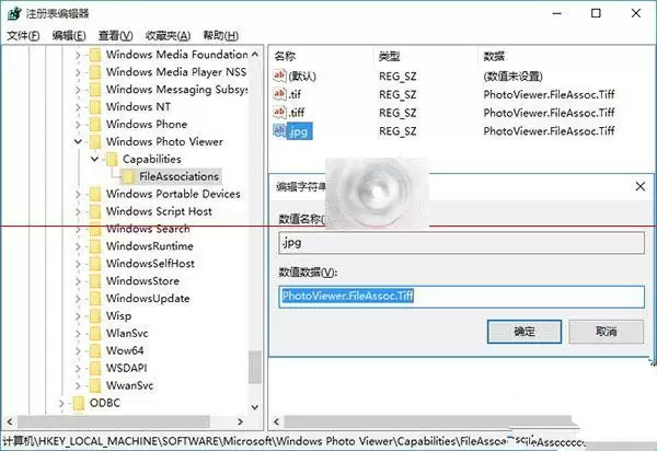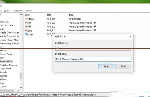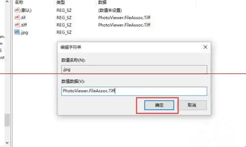 第四步:设置键值。这一步是关键。假设你想恢复 .jpg 文件的关联,那么就将这个新建的字符串值 名称 改为 .jpg。然后双击它,在“数值数据”一栏中输入 PhotoViewer.FileAssoc.Tiff,点击“确定”。