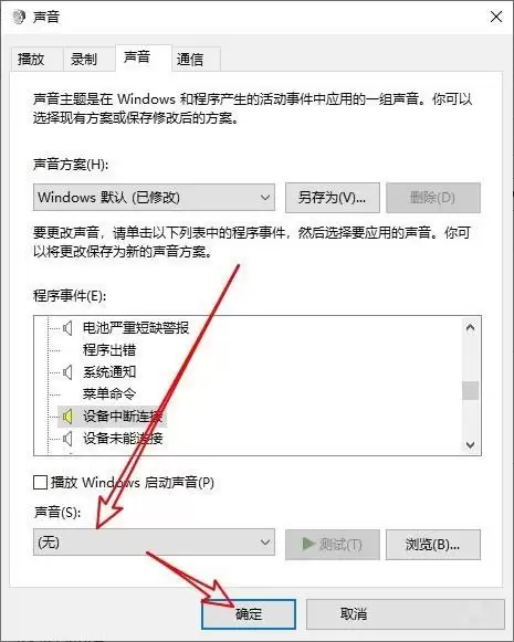 5、点击之后,熟悉的“声音”设置对话框就弹出来了。在“程序事件”的列表里,仔细向下滚动,找到“设备中断连接”这一项,并选中它。
