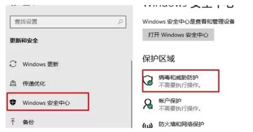 第三步:进入“更新和安全”后,在左侧菜单栏中选择“Windows安全中心”,然后点击右侧的“打开Windows安全中心”。紧接着,在主安全面板中,找到并点击“病毒和威胁防护”这个核心模块。
