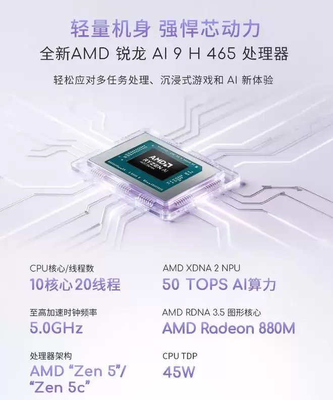 如果说外观设计是“面子”,那么性能就是实打实的“里子”。a豆14 Air 2026最令人惊喜的,莫过于它在990克机身内实现的45W强悍性能释放。这背后,全新的AMD锐龙AI 9 H 465移动处理器功不可没。它基于“Zen 5”架构,拥有10核20线程,至高加速频率可达5.0 GHz,多任务处理和内容创作效率显著提升。其集成的AMD Radeon 880M显卡,采用RDNA 3.5架构,具备12个显示核心,图形性能足以在1080P画质下流畅运行《英雄联盟》、《CS2》等主流网游。