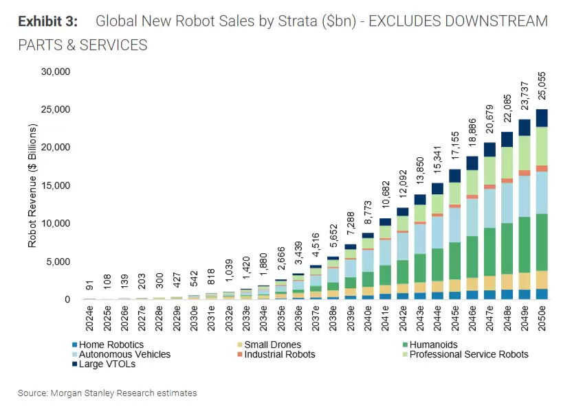 最近,摩根士丹利Adam Jonas团队发布的一份研报,就为我们揭示了这幅更宏大的图景。报告预测,到2050年,全球机器人新销售市场规模将达到惊人的25万亿美元。但请注意,这个数字仅仅反映了新机器人的销售。