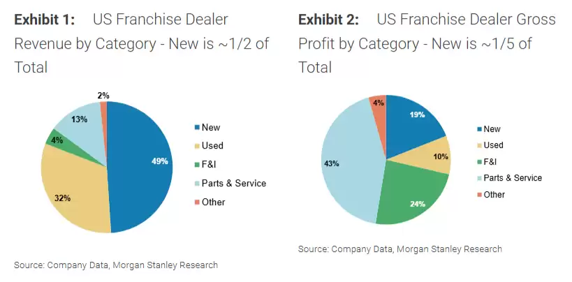 为了量化下游市场的潜在价值,摩根士丹利做了一次精彩的跨界对标——他们拆解了美国六家上市特许汽车经销商的收入结构。