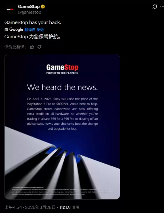 GameStop通过其社交媒体渠道宣布,将在全美范围内为硬件产品提供额外的折抵优惠。这项活动将持续到4月4日,意图再明显不过:就是为了帮助玩家“赶在涨价前,以更低的成本完成升级”。