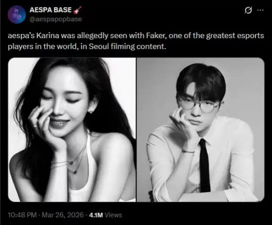 近日,海外社交媒体平台上一则爆炸性爆料,引发了电竞圈与韩娱粉丝的广泛关注。有匿名账号宣称,拍到了电竞传奇选手Faker(李相赫)与韩国顶级女团aespa队长Karina在首尔私下约会的画面,消息迅速发酵,成为网络热议焦点。
