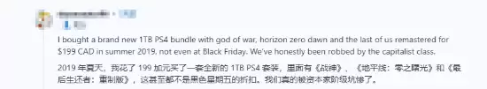 回忆总是在对比中显得格外珍贵。有玩家分享道,在2019年夏季(甚至并非“黑五”大促期),他只花费了199加元,就购入了一套1TB版本的PS4同捆套装,其中竟然包含了《战神》、《地平线:零之曙光》和《最后生还者 重制版》三款顶尖大作。与当今的定价水平相比,过高的价格确实在切实影响玩家的消费体验与游玩心情。