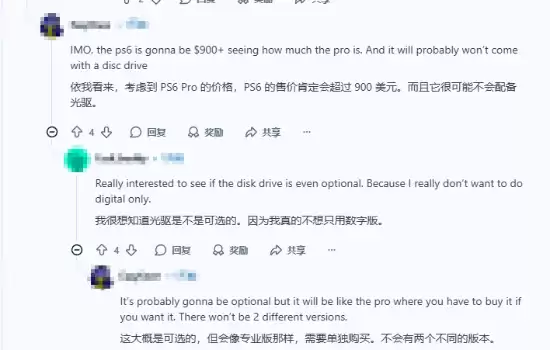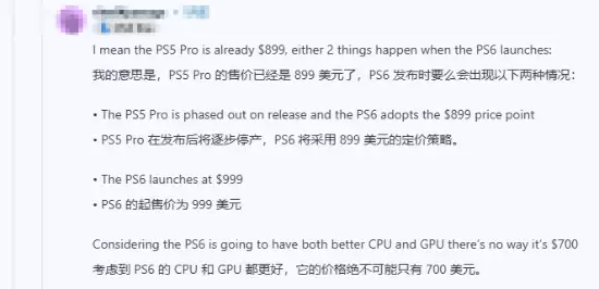 玩家的预测则更为大胆。有人提及,PS5 Pro的定价已高达899美元。以此为参考,PS6要么直接继承899美元的定价,同时让PS5 Pro逐步退市;要么将起售价进一步推升至999美元。毕竟,更强大的CPU和GPU性能意味着更高的制造成本,期待售价回归700美元区间,在目前看来并不现实。