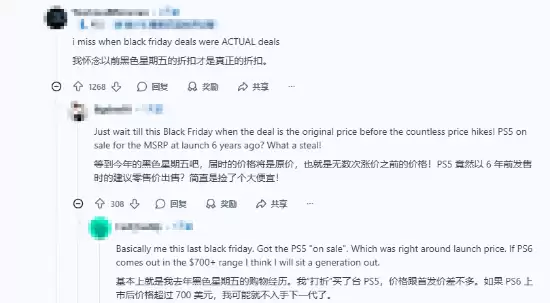 帖子下方,充满了玩家们的感慨与怀念。许多用户表示,非常怀念早期“黑五”促销的诚意,那时的折扣才是真正意义上的“让利”。更有玩家幽默地预测,等到下一个“黑五”,所谓的“特价”或许就是涨价前的原价了。以PS5为例,如果现在还能以六年前的首发建议零售价买到,恐怕都会被玩家们视作难得的“捡漏机会”。