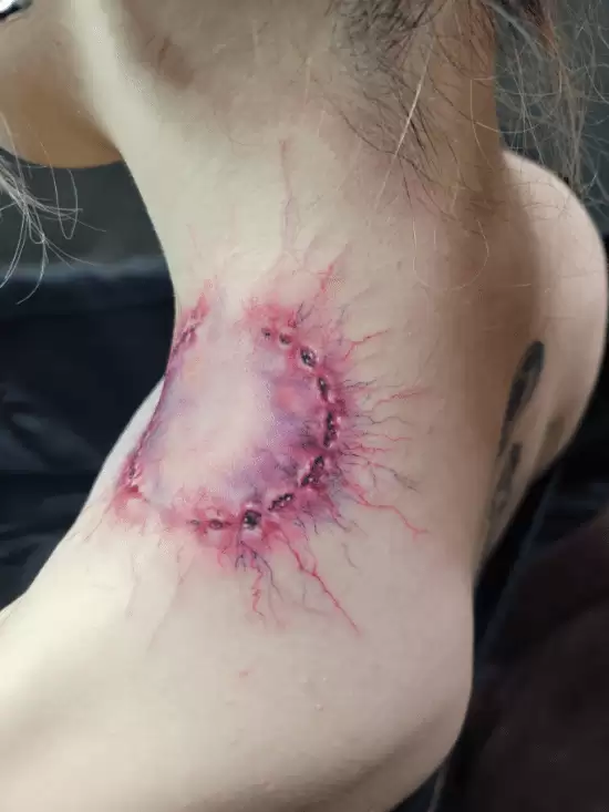仔细观察作品,所有视觉焦点都高度集中于伤口本身:皮肤撕裂的立体层次、皮下蔓延交织的青黑色血管网络、以及模拟组织坏死的溃烂质感,每一个细节都被刻画得入木三分。这种极高的视觉辨识度与真实感,使其与传统装饰性纹身形成了鲜明对比,更像是一件融合了高级特效化妆、生物雕塑与皮肤绘画的概念艺术杰作。