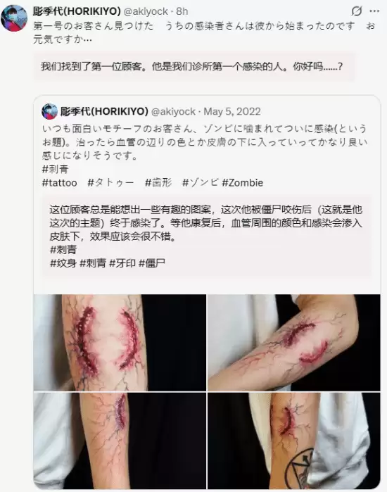 必须承认,此类极具实验性的暗黑系纹身风格仍属小众,要找到能够欣赏并勇于尝试的顾客颇具挑战。然而,彫季代于近日兴奋地更新了动态,宣布迎来了首位敢于接纳“感染者”主题的顾客。他的配文充满了沉浸式的叙事感:“我们找到了第一位顾客。他是我们诊所接待的首位感染者。你现在感觉如何……?”字里行间,宛如在记录一次发生在虚构末世中的神秘医疗档案,极大地增强了作品的故事性与互动体验。