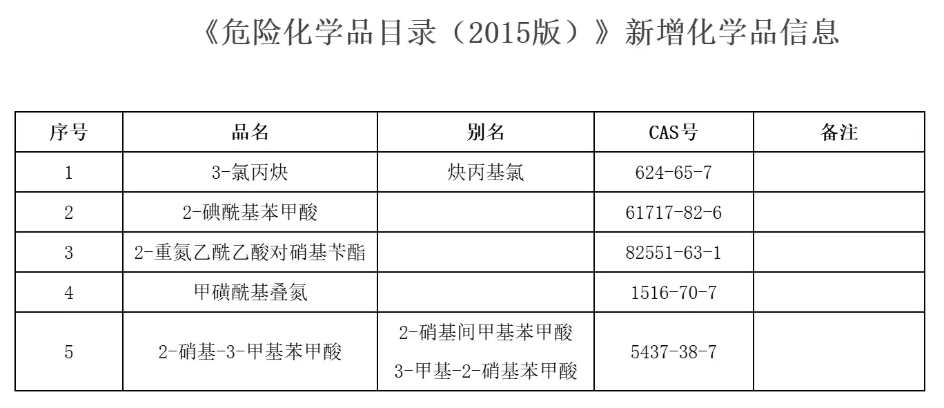 此次被列入目录的化学品包括:3-氯丙炔、2-碘酰基苯甲酸、2-重氮乙酰乙酸对硝基苄酯、甲磺酰基叠氮以及2-硝基-3-甲基苯甲酸。公告明确,自发布之日起,相关管理措施即刻生效。