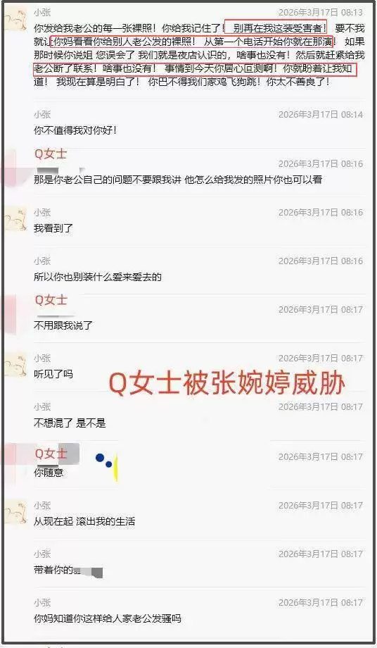 Q女士的爆料,将张婉婷推向了舆论的风口浪尖。根据公开的聊天记录,张婉婷在发现丈夫出轨后,并未直接质问宋宁峰,而是将怒火全部发泄在Q女士身上。她不仅威胁要公开Q女士的私密照片,还扬言“发给你妈妈、直系亲属,甚至未来的伴侣”,甚至牵连无辜的演员高露(Q女士的雇主),称“要让所有人知道你是什么货色”。