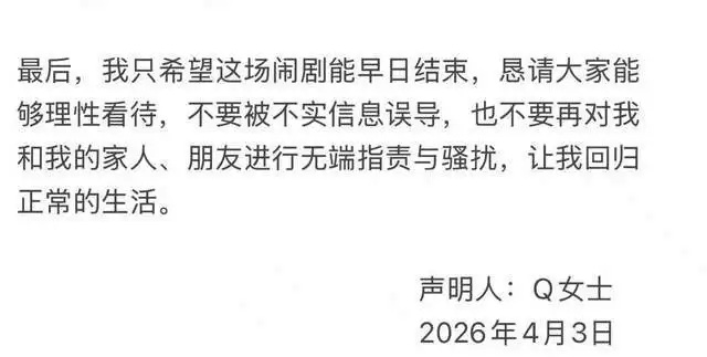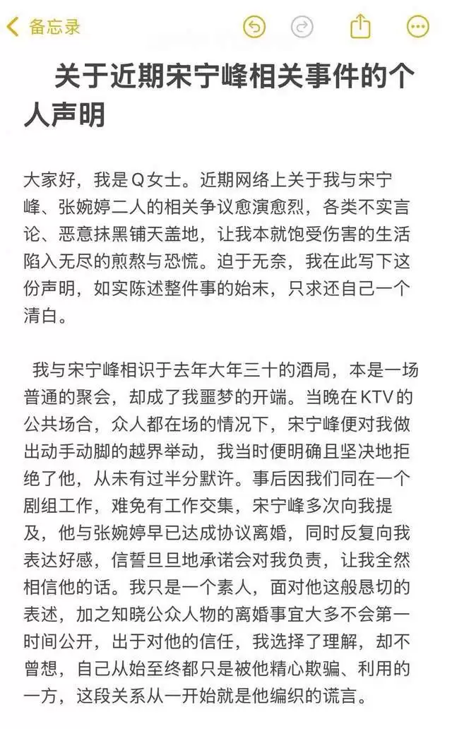 Q女士在声明中称,自己并非主动介入宋宁峰婚姻,而是被男方精心设计的骗局所害。据其描述,两人于2025年大年三十的酒局初次见面,宋宁峰当场对其毛手毛脚,被她拒绝后仍不罢休。