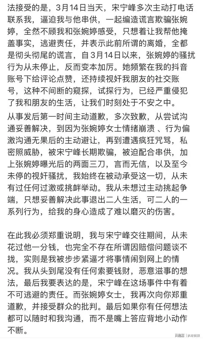 更令人震惊的是,Q女士在文中指出,张婉婷曾多次使用宋宁峰的手机与她进行联系,沟通中使用的言辞极为激烈且充满攻击性,甚至对其个人心理状态造成了严重负面影响。