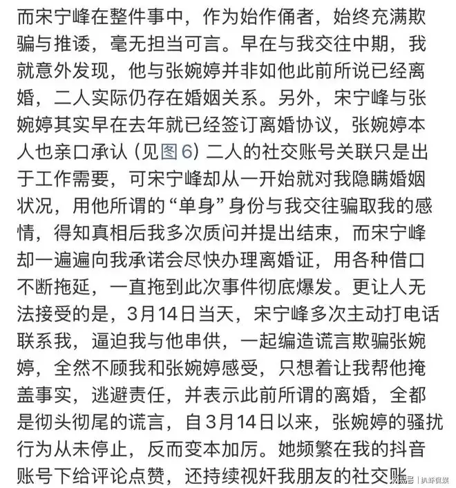 在这篇长文中,Q女士严厉批评宋宁峰在整个风波中表现得缺乏责任与担当。她回忆道,在交往过程中段,她便已察觉宋宁峰与张婉婷的婚姻关系并未真正结束。