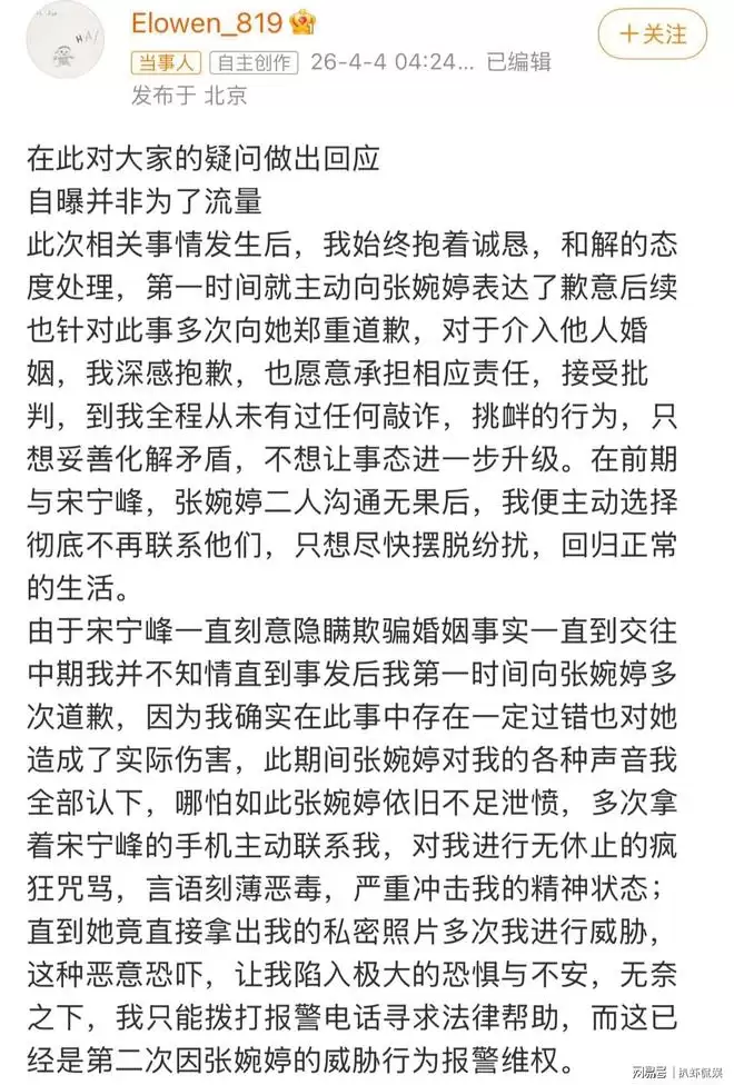 4月4日凌晨,事件中的核心当事人之一——此前被指与宋宁峰关系暧昧的Q女士,终于通过个人社交账号发布了详细声明。她明确表示,此次发声并非为了博取流量,而是始终秉持着诚恳沟通、寻求问题解决的态度。Q女士透露,她已在事发后第一时间主动联系张婉婷并致歉,对于自己在不知情状态下卷入他人婚姻深感懊悔与自责。