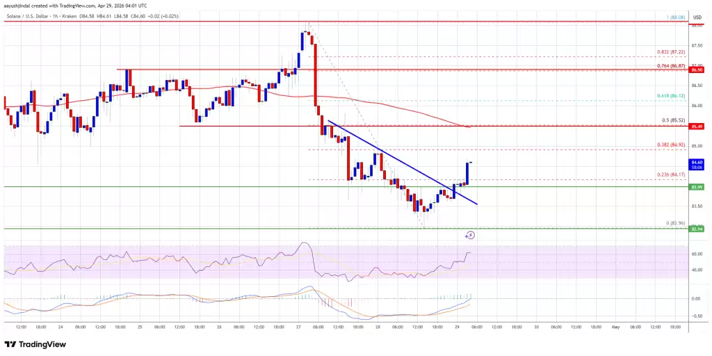 价格从低点出现了一波小幅反弹,目前已经站上了从88.08美元高点跌至82.96美元低点这波下跌行情的23.6%斐波那契回撤位上方。更值得关注的是,在SOL/USD的小时图上,价格成功突破了连接两条下降趋势线所形成的阻力区域,该阻力位此前大约在84美元附近。现在,Solana的交易价格正徘徊在85美元和100小时简单移动平均线附近。