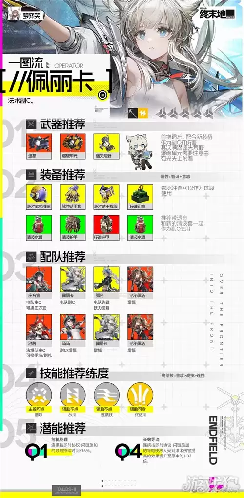 关于阵容中的佩里卡,有一个关键的养成思路值得分享:依旧建议将其偏向辅助定位培养,重点堆叠源石技艺属性。这么做的好处显而易见——能有效节约整体的养成资源成本。让她专注于强化与辅助职能,往往能比强行转为输出获得更高的团队收益。