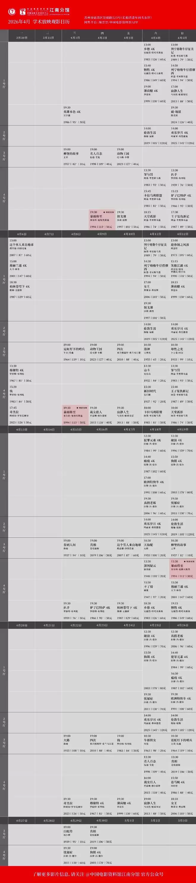 今日适逢农历清明节。中国电影资料馆北京主馆暂停放映一日,明日恢复;而位于苏州的江南分馆则全天开放,并特别策划了两部高口碑影片作为清明专场。完整的今日片单与放映时间表,已为您汇总在文末的排片图中,方便您快速查询与安排。