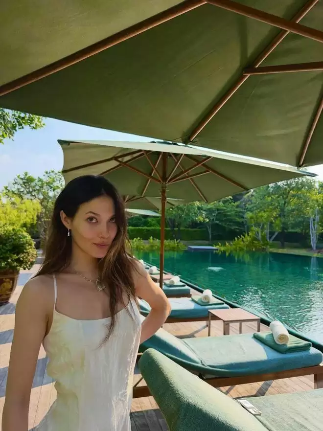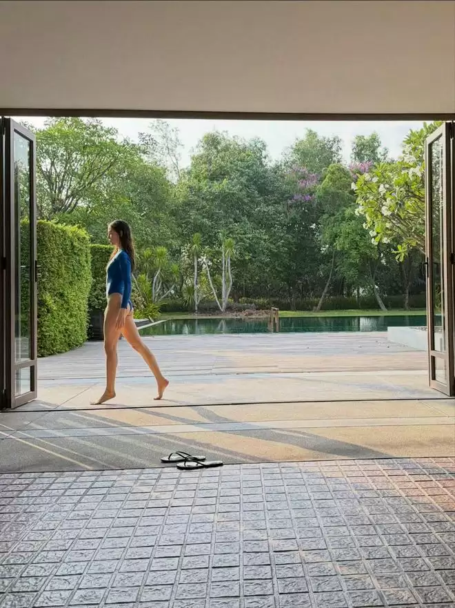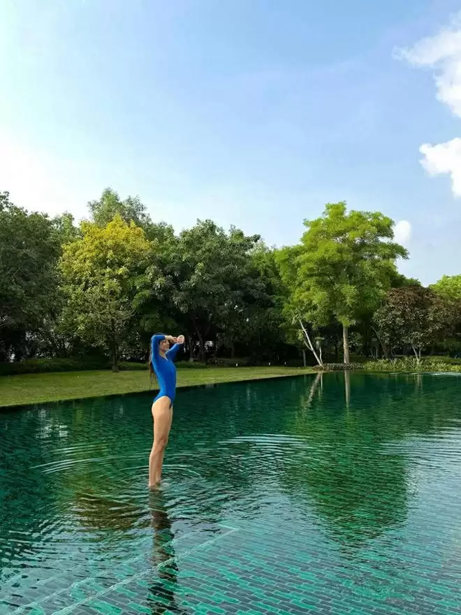 从照片背景推断,目的地颇具泰国度假胜地的特色:青山环绕,碧水白沙,环境静谧宜人。姐妹俩显然避开了拥挤的游客区,选择在私密性极高的度假村内享受宁静时光。来到东南亚,“阳光沙滩”是经典主题,谷爱凌也大方分享了多张泳装照,展现出运动员独有的健美体态。年轻、健康、身材匀称——这些优势在镜头下格外醒目。其中一张照片尤为吸睛:她身着蓝色连体泳衣,刚从泳池上岸,发丝湿润,舒展身姿的瞬间,其高挑身材与修长双腿成为画面焦点。