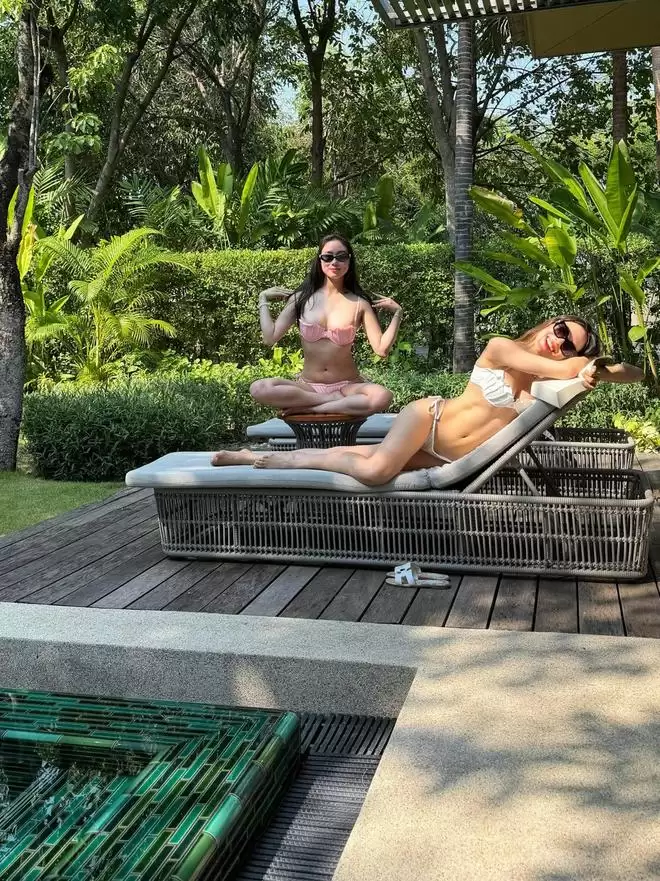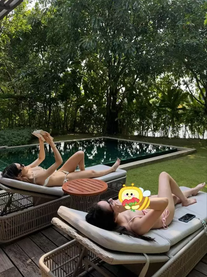 享受日光浴时,何超欣也一同入镜。画面中,两人衣着清凉,悠闲地躺在泳池边的躺椅上。谷爱凌手捧书籍,读得专注;何超欣则完全放松,沉浸于悠闲时刻。另一张正面合影里,何超欣盘腿而坐,谷爱凌则慵懒地趴卧在椅上,手持书卷,姿态妩媚。她们都自信地展现出健康姣好的身材,面对镜头笑容灿烂,那种由内而外散发的活力与自信,极具感染力。