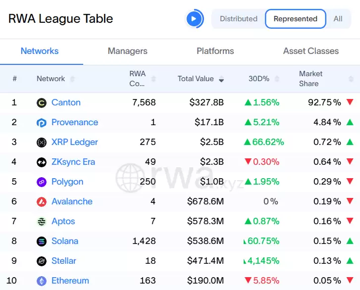 放眼全球区块链网络,按承载的RWA价值排名,XRP Ledger已经稳稳坐在了第三把交椅,仅次于Canton和Provenance。这意味着,它已经超越了Polygon、Solana和以太坊等一众行业巨头。更值得关注的是其增长势头:在过去一个月里,XRPL的RWA价值增长了66%,是排名前十的网络中增速最快的。这或许预示着,RWA的战场,正在迎来新的变量。