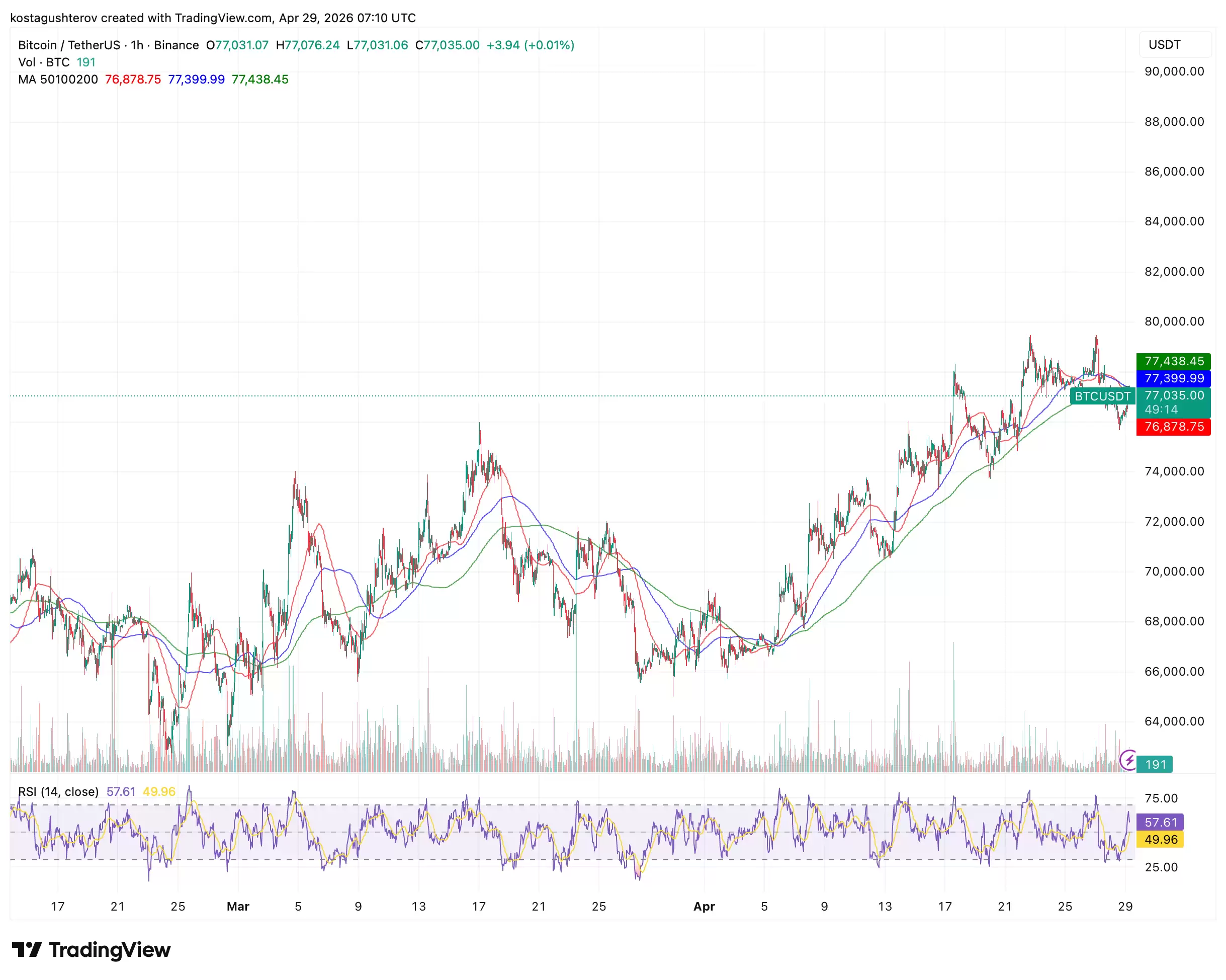 BTC 价格:77,035 美元,目前位置高于 50 日均线,但被压制在 100 日及 200 日均线之下。