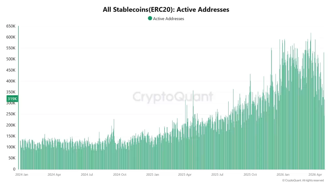 ERC20 稳定币活跃地址:达到 319K,显著高于历史基线水平。