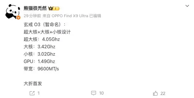 最新消息来了。数码博主“熊猫很禿然”近日曝光了小米自研玄戒O3芯片的关键参数,信息相当具体。根据爆料,这颗芯片采用了超大核、性能大核与小核的三丛集架构设计。具体频率方面,超大核主频高达4.05GHz,性能大核为3.42GHz,能效小核也达到了3.02GHz。图形处理单元(GPU)的频率则为1.49GHz,内存带宽高达9600MT/s。从纸面参数看,这无疑是一套瞄准高性能的配置。