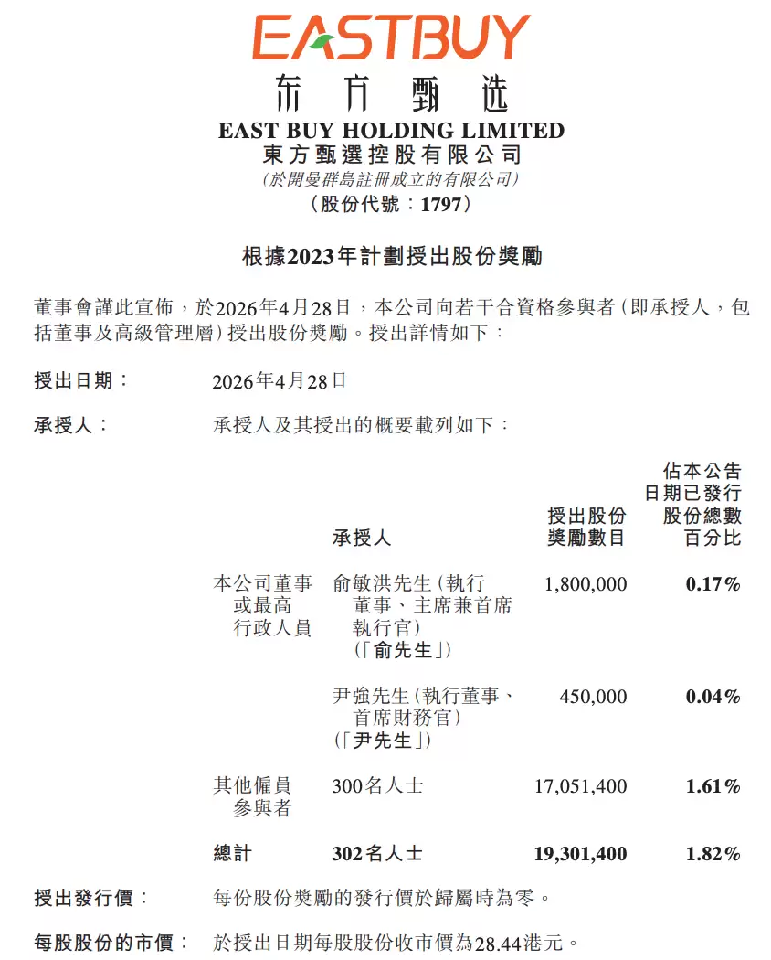 4月29日消息,就在前一天晚上,东方甄选(01797.HK)发布了一份引人注目的公告。公司宣布,依据其2024年股份激励计划,将向包括董事、高管及核心员工在内的302人,授出总计1930.14万股股份奖励。这笔激励约占公司已发行股份的1.82%,若以公告当日28.44港元/股的收盘价计算,总价值相当可观。