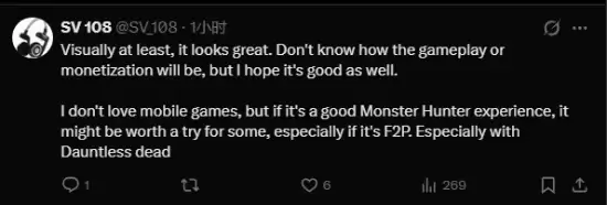 当然,话题终究要回归游戏本身。除了美术,玩家们的关注点也相当务实。有评论指出:“至少从目前看到的画面来说,质感相当不错。至于核心玩法和未来的商业化模式,现在下结论还为时过早,希望整体品质能保持一致。” 另一条评论则代表了部分核心玩家的心态:“虽然我个人通常不青睐手游,但如果它真的能提供原汁原味的《怪物猎人》体验,尤其是以免费模式呈现的话,那绝对值得一试。”