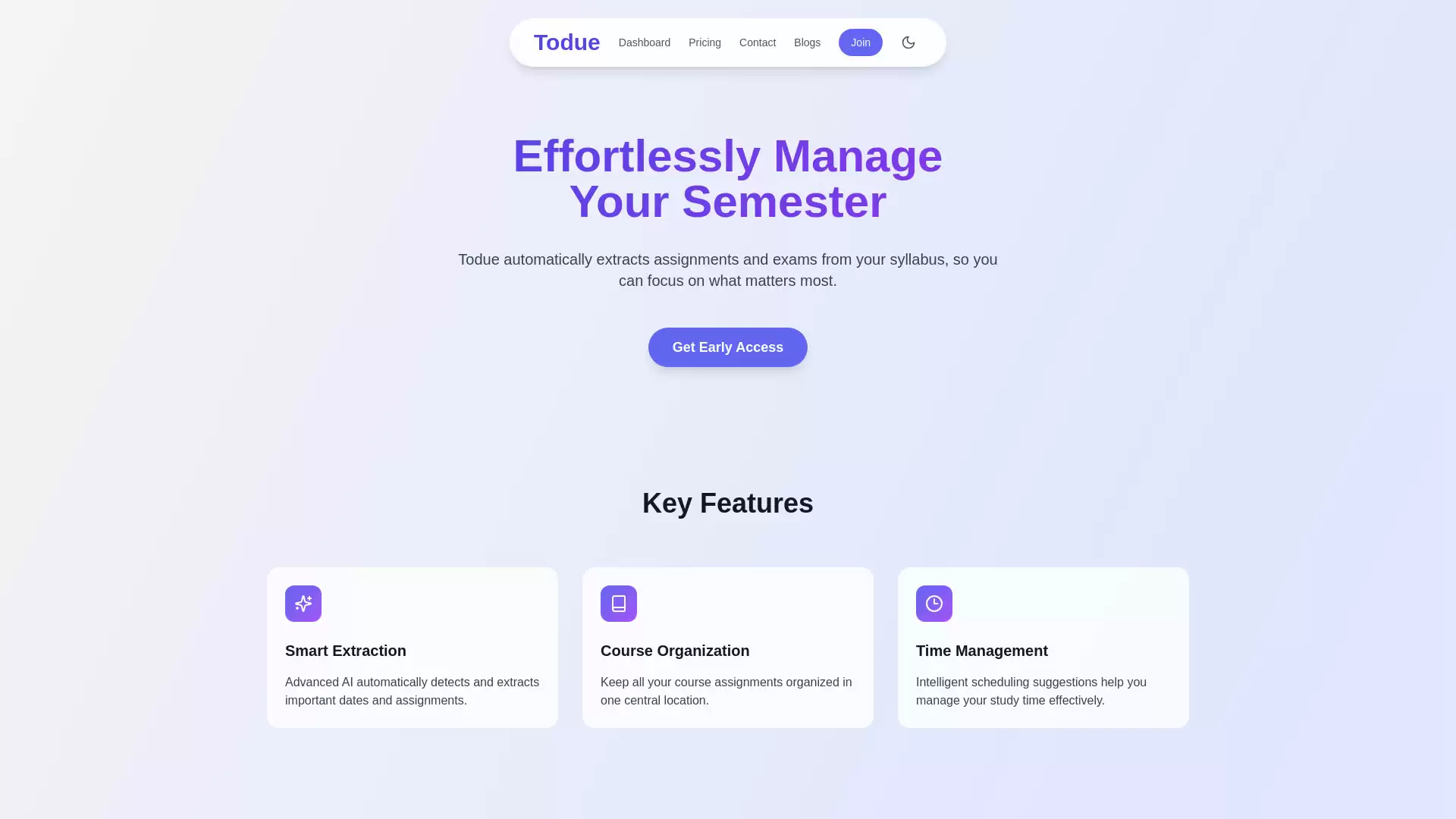 答案就是Todue。这款工具的核心使命很明确:自动把你课程大纲里的所有任务,直接同步到Google日历里。本质上,它扮演了一个“智能学术助手”的角色,帮你把纸面或PDF上的计划,转化为日历上清晰可视的时间线。从此,跟手动输入和无意间错过截止日期的日子说再见吧,它主打的就是高效组织与更智慧的时间管理,让学业安排变得轻松不少。
