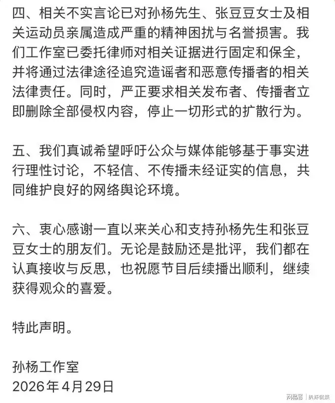 此外,声明中强调,孙杨与张豆豆始终遵循节目组要求,配合完成录制,从未干涉过节目播出安排。同时,二人表示接受外界基于事实的讨论,对不足之处愿意虚心接受,但前提是拒绝造谣。