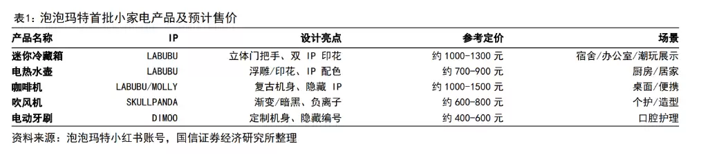 其中,LABUBU迷你冷藏箱参考定价1000至1300元,采用手绘图案及立体造型设计;SKULLPANDA吹风机定价600至800元,搭载负离子功能;DIMOO电动牙刷定价400至600元,设有隐藏限量编号,赋予收藏属性。