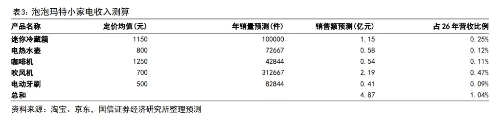 国信证券预计,泡泡玛特小家电2026年收入约为4.87亿元,占当年总营收约1.04%。分品类看,吹风机为第一大单品,预计年销量约31.3万件、销售额约2.19亿元;迷你冷藏箱预计年销量10万件、销售额约1.15亿元;咖啡机、电热水壶及电动牙刷合计贡献约1.53亿元。