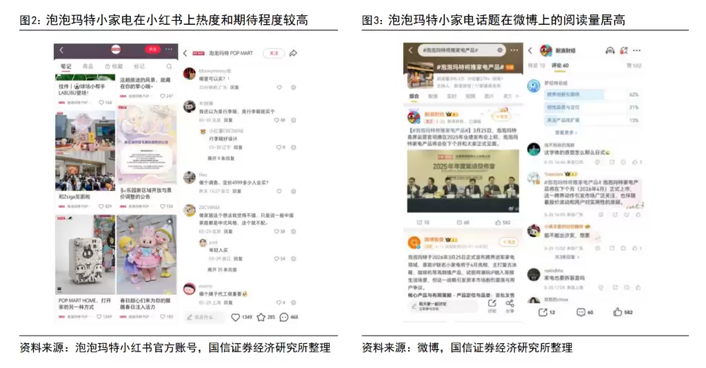 据国信证券统计,多平台数据显示(数据截至4月15日15时),泡泡玛特小家电已积累相当高的社媒热度:抖音“泡泡玛特家电”话题累计播放量约1亿次;微博话题阅读量达395.1万次,其中约六成用户表达对跨界创新的期待,约两成持观望态度。小红书上,LABUBU冷藏箱相关帖子累计点赞数超1300,显著高于同期其他内容。
