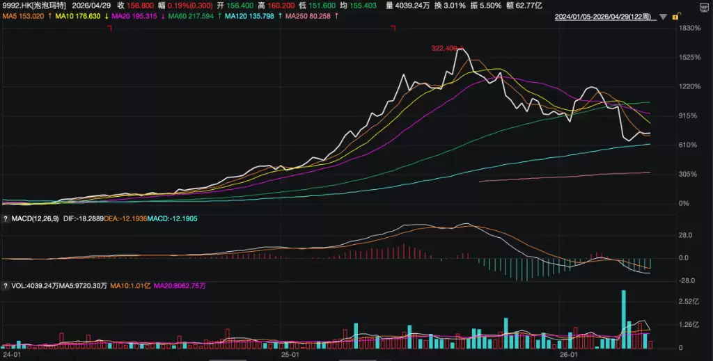 Labubu冰箱正式开售前日,市场热度已提前引爆:二手平台报价一度被炒至逾9万元,京东预售预约人数突破4.5万。4月29日早盘,泡泡玛特股价应声走高,一度涨近4.6%,截至发稿涨幅收窄至2.48%,报157港元。拉长时间维度看,公司股价自2025年8月底触及322港元的历史高点后便一路下行,至今股价已腰斩。
