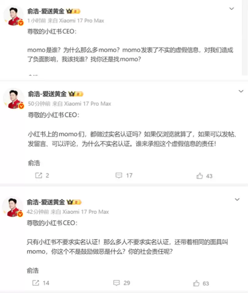 紧接着,俞浩将矛头对准了平台的底线机制——实名认证。他质问小红书,这些活跃在发帖、留言、评论一线的“momo”账号,是否真正落实了实名制?话说回来,如果账号可以随意发声却隐匿在默认ID背后,那么虚假信息发布的责任界定,恐怕就成了一纸空文。