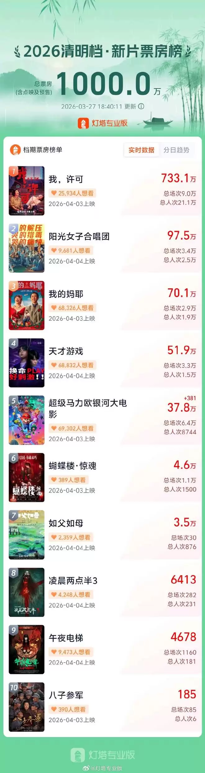 市场热度比预期来得更早。根据灯塔专业版实时数据,截至3月27日18时40分,距离清明假期尚有数日,档期内新片的点映及预售总票房已突破千万元大关。这一亮眼成绩为即将到来的清明档票房竞争,提前注入了强劲信心。