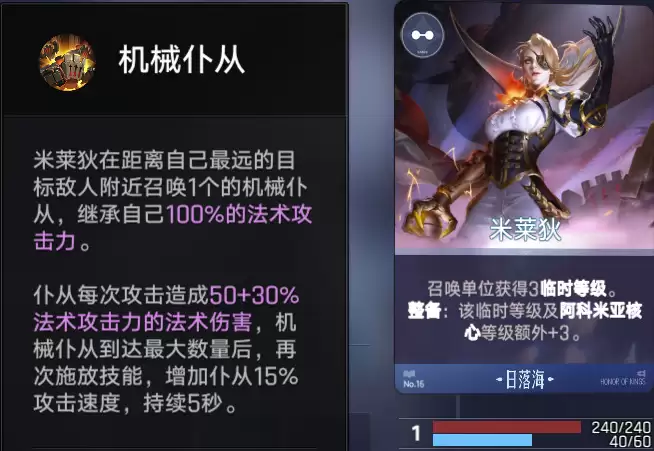 接下来,为亚连搭配米莱狄。米莱狄是日落海阵营中非常实用的英雄,她能提升召唤物的临时等级。通过她的整备效果,可以进一步增强我方核心的能力。当阵容整体战力不足时,应优先考虑让米莱狄觉醒,她能带来可观的战力补充。她的技能是在距离自己最远的敌人附近召唤一个机械仆从,该仆从能继承米莱狄100%的法术攻击力。另一个推荐的输出位是安琪拉,她在日落海英雄中属于强势的法系输出。后期的升级节奏,则需要根据经济情况灵活调整。