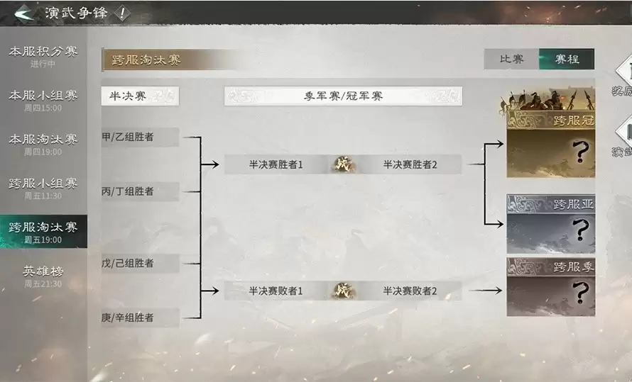 战火是如何点燃的呢?对战会先在你们本服务器所有报名的玩家中展开。从六十四强一路厮杀,淘汰晋级,直到决出本服的第一名。但这还不是终点——本服的前三名将获得更高级别的门票,继续参加跨服淘汰赛。跨服比赛直接从十六强开始,最终在众多服务器的强者中,决出唯一的跨服总冠军。