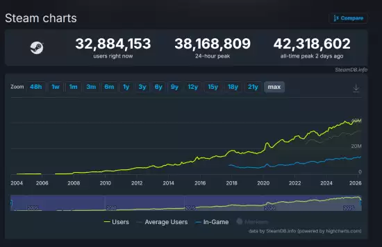 最近来自外媒playground的一则报道,在游戏圈内引发了不小的关注。根据SteamDB的数据追踪,尽管面临多国诉讼以及因供应链问题调整硬件发售计划等风波,Valve旗下的Steam平台还是悄悄地刷新了一项纪录:其同时在线用户数达到了前所未有的4231万人。