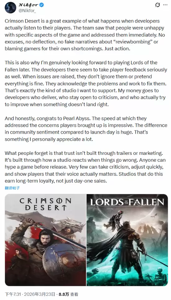 游戏博主@Nikfor_ 的评价可谓一针见血:“《红色沙漠》提供了一个绝佳范本,它展示了当开发者真心听取玩家时会发生什么。团队直面大家对游戏某些具体环节的不满,并立刻着手修复。整个过程,没有借口,没有推诿,更没有编织关于‘水军’的虚假叙事,或是把自身短板怪罪到玩家头上。他们只做了一件事:行动。”