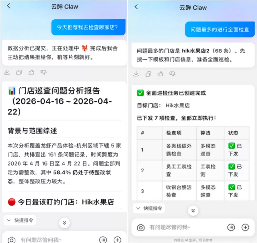 近期海康威视发布的云眸Claw,正是沿着这一思路落地的典型。它并未追求打造一个“万能助手”,而是基于多年深耕零售连锁门店管理的深厚积淀,将AI智能体能力深度整合、嵌入到“巡店”这一核心且复杂的管理链路中。其目标是让系统不仅能理解任务,更能承接执行、实现闭环,并具备柔性调整的能力。