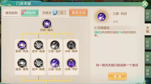 三星-抗封:这是守护流体系的核心天赋。当处于“镇元”状态下时,它能额外提供大量封印抵抗率,让对手的一速封难以对你生效。若再搭配特定器灵,这份额外的抗性还能传递给队友,收益非常高。