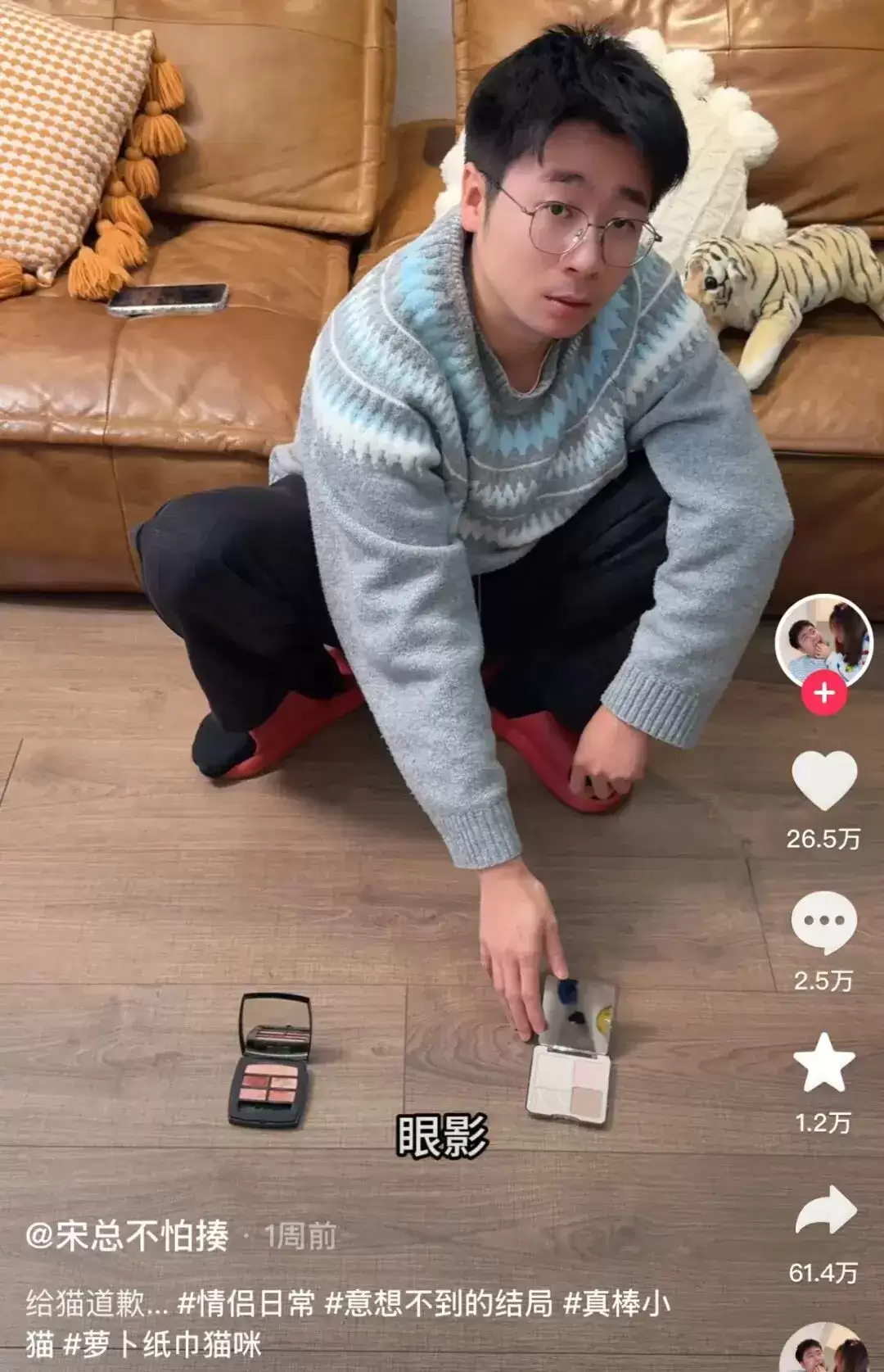 没有宠物怎么办?让男朋友来演。于是,女生发出指令,男生蹲在地板上,眼神里充满“对知识的渴望”,还得故意错几次,在对方“严厉”纠正后选对答案,最终收获一句“真棒”。这看似是模仿,实则是情侣间的趣味调情与某种“服从性测试”——一个愿意当着全网演“傻狗”的伴侣,至少证明了他愿意为你豁得出去。
