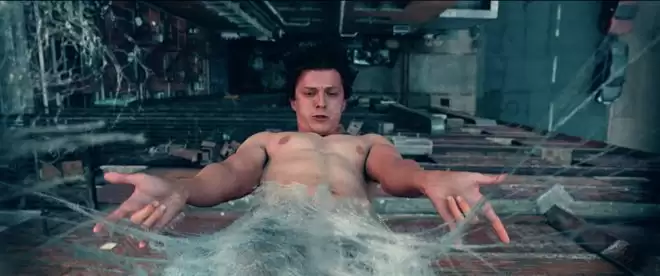 对任何从睡梦中惊醒的人来说,这大概都是最恐怖的场景之一。DNA变异后的彼得,被不知从何而来的蛛丝裹成的茧倒吊在半空。情急之下他下意识地去启动蛛丝发射器,却摸了个空。然而,就在即将坠地的瞬间,奇迹发生了。看来,荷兰弟要是再遇上托比·马奎尔版蜘蛛侠,关于“射丝”这事儿,俩人可算有共同话题了。